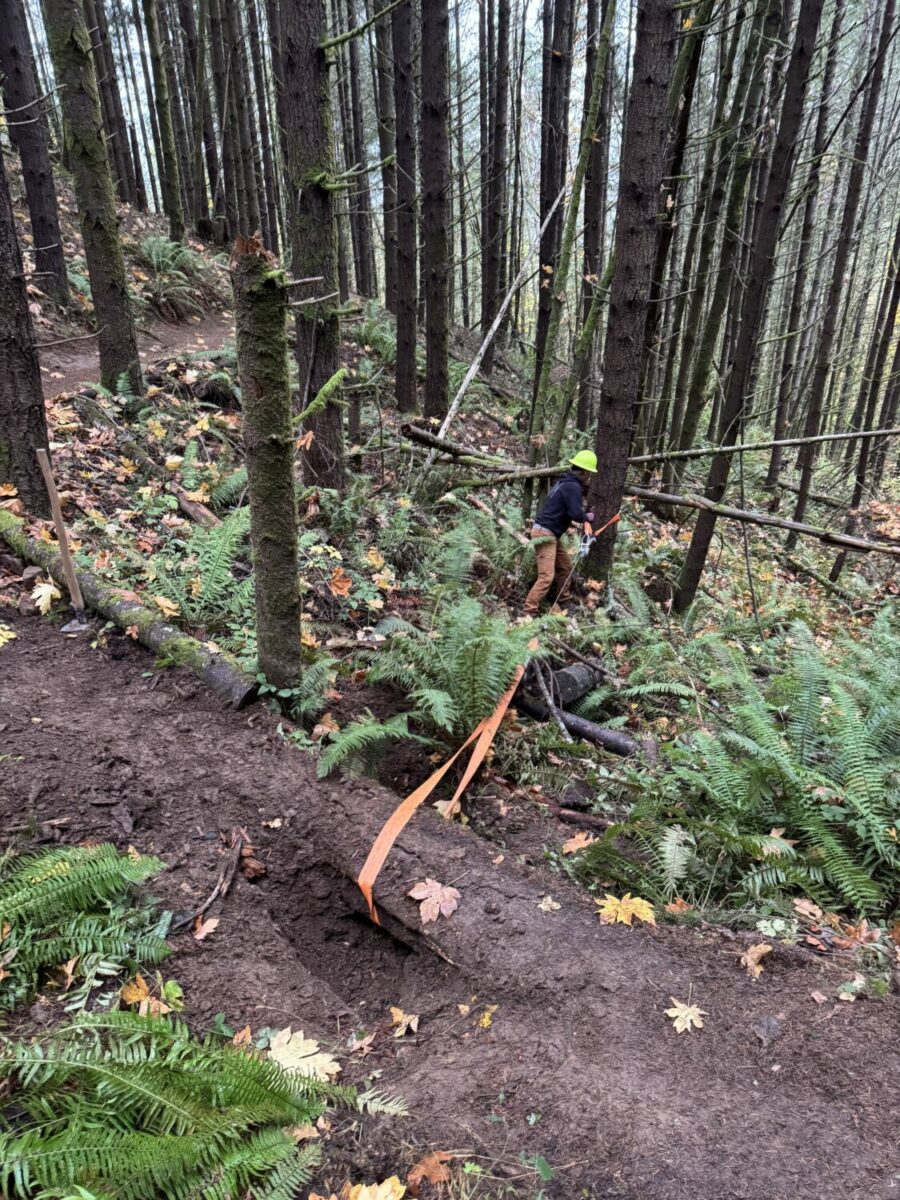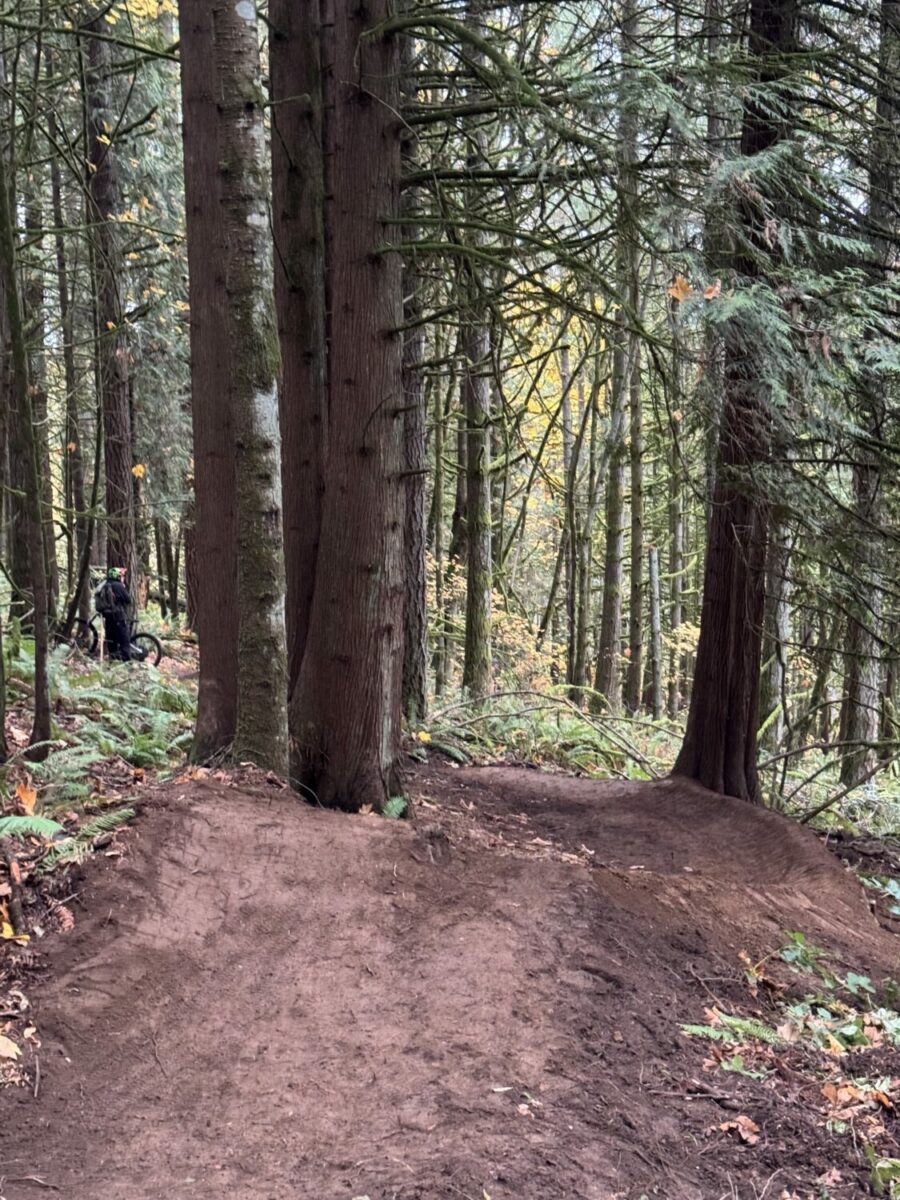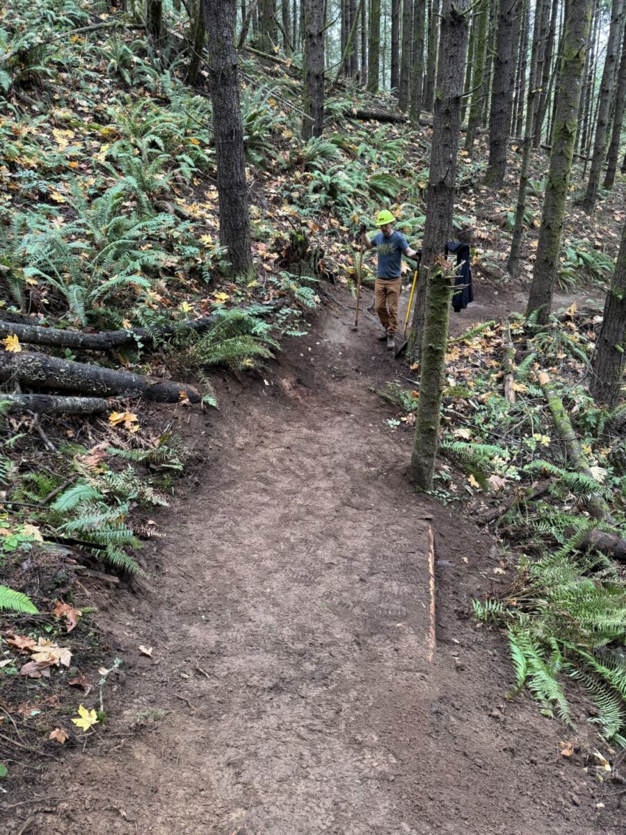 On November 15, a crew of 17 volunteers gathered at Rocky Point to give Levitation some much-needed attention. This trail has a personality all its own, and the team focused on improving one of its trickier features: a loose, off-camber berm marked by an exposed root and tired logs that had long outlived their usefulness.