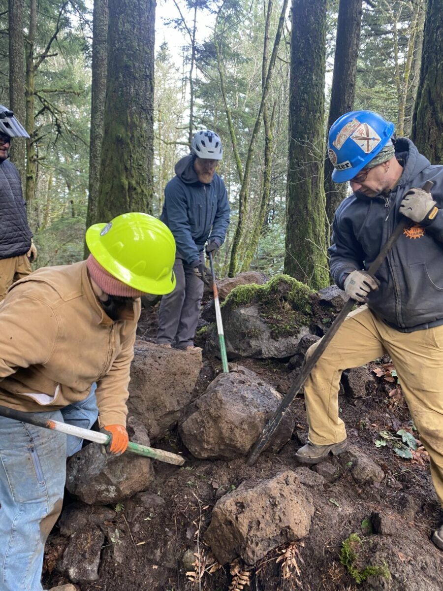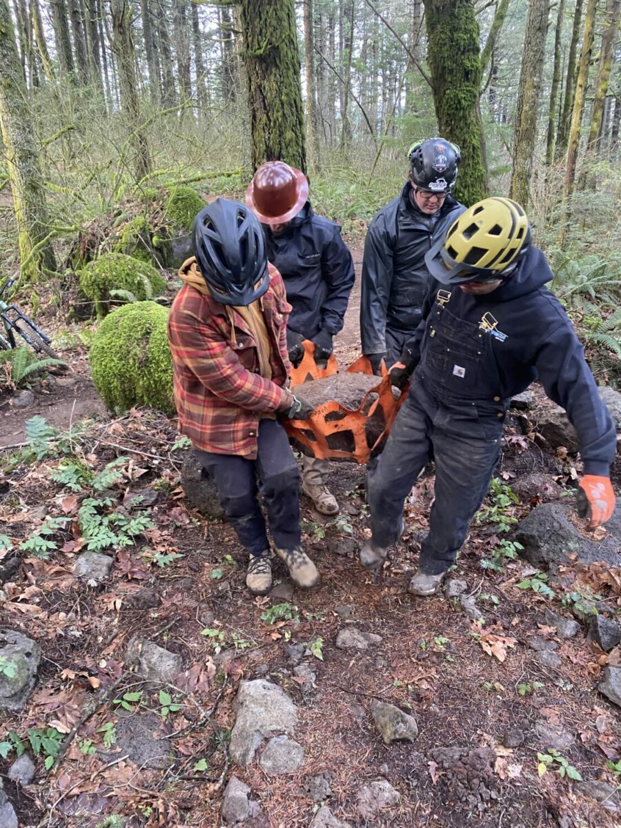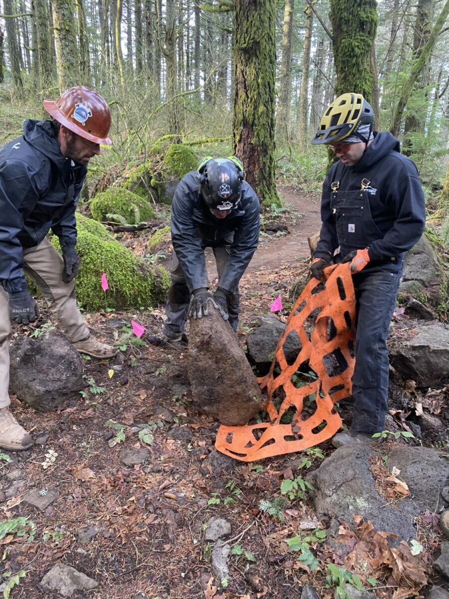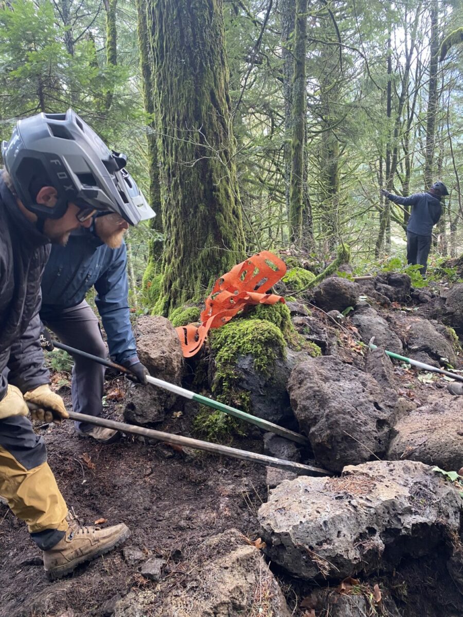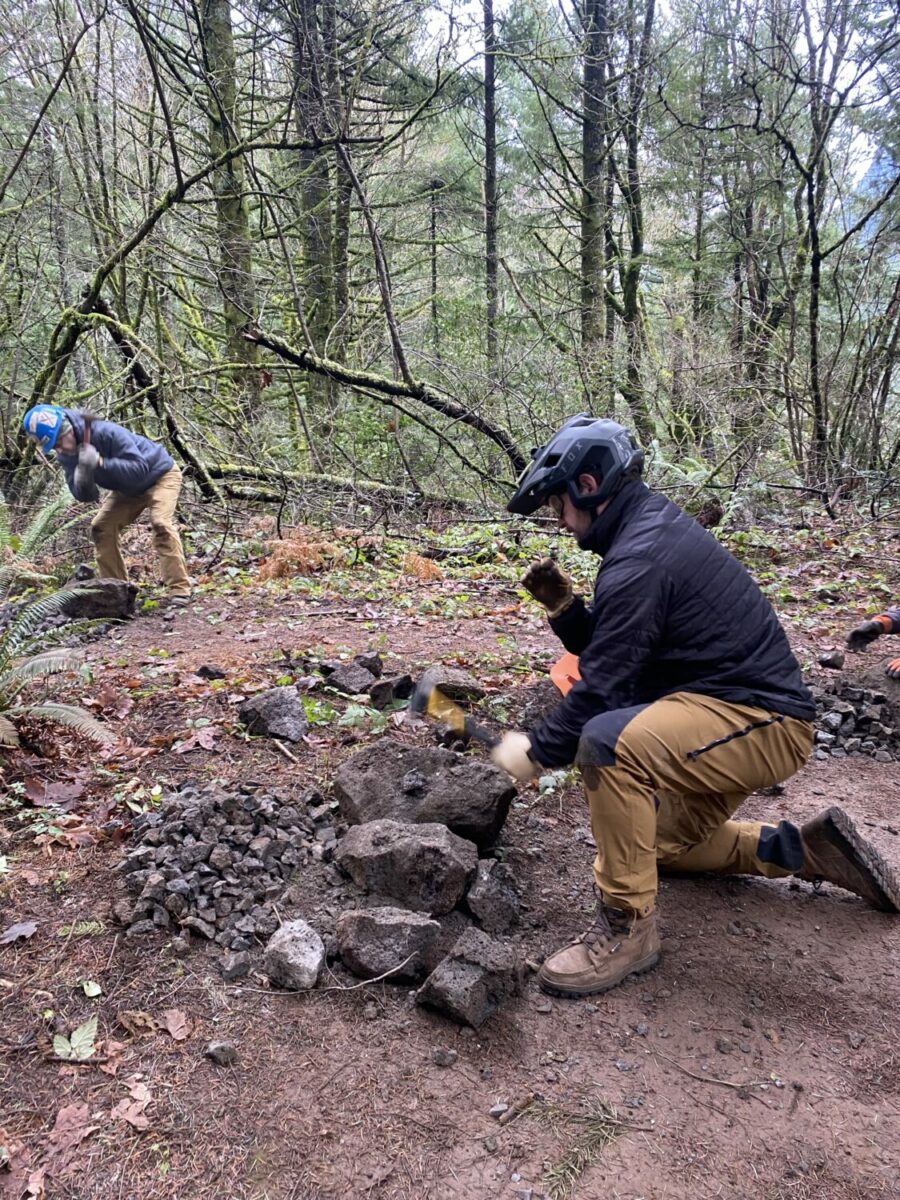 This past Saturday the 10th, the Trail Sustainability Institute (TSI) brought rock work to life on the Ouroboros Trail in Cascade Locks with a hands-on Rock Work and Armoring clinic that was equal parts education, sweat, and puzzling stones together. Volunteers were joined by guest instructor Shane Wilson of Trailhaus, whose depth of experience as a professional trail planner and designer added invaluable perspective to the day. Alongside TSI instructors Nancy Stone and Paul Hobson, Shane helped guide participants through not just how to move and place rock, but why thoughtful stonework matters for long-term trail sustainability and rider experience.