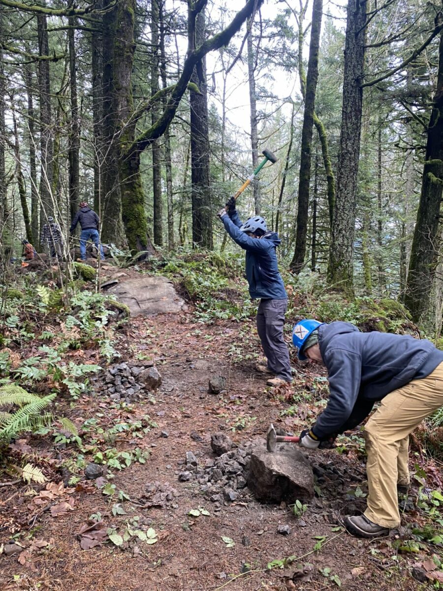With rocks selected, it was time to move them. Volunteers practiced using rock bars, fulcrums, and rock nets, breaking into groups to safely maneuver stones that were well beyond single-person lifts. Along the way, they experimented with techniques like rowing rocks, floating buried stones, and using mechanical advantage to let physics do the heavy lifting. A nostalgic moment came when volunteers channeled their inner Barney Rubble, wielding sledges and double jacks to turn oversized rock into angular “rock crush” for backfill, critical for locking stones in place and creating durable tread.